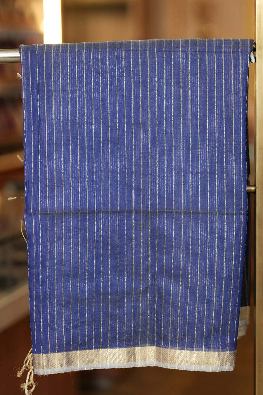 The saree comes paired with a coordinated sapphire blue blouse featuring delicate silver stripes - adding a refined contrast and completing the look with subtle sophistication.