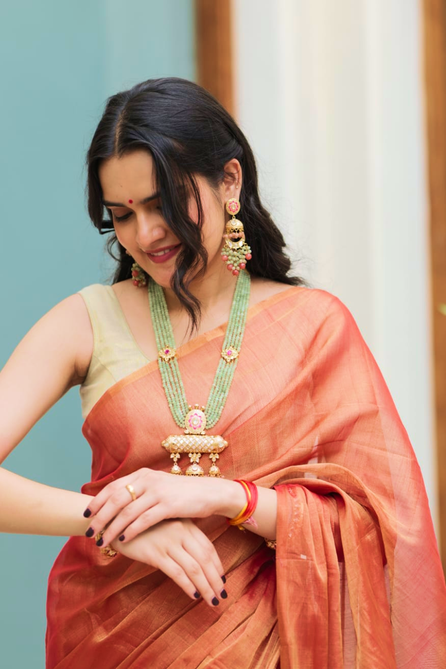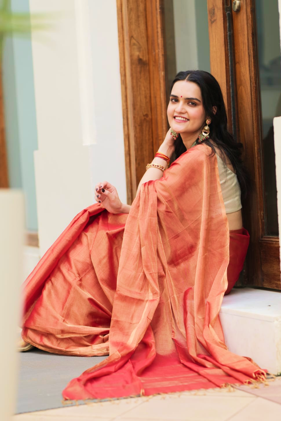 Bathed in hues of warm gold and soft coral, The Sunset Serenade captures the delicate glow of twilight in pure Maheshwari tissue silk. This masterpiece shimmers with understated luxury - its gossamer texture and ethereal sheen a celebration of India's regal weaving heritage.